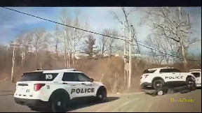 Police cruiser rolls over after PIT maneuver when stuck on a trailer during chase