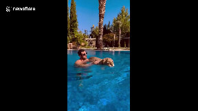 A zookeeper helps a female lion swim for the first time inside a swimming pool in Saudi Arabia...
