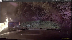 Pursuit suspect bails on foot, pickup on fire rolls back into patrol car